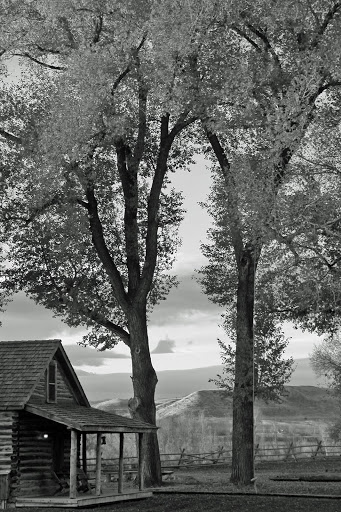 The picture at the right is one I took early one morning as the sun was rising. The view is to the south east. You can see one of the cabins where we stayed on the left. But behind the cabin and between the trees is the horizon of mountain and sky. Everywhere I looked, the sky arched above and the foothills and plains and river sculpted the view.