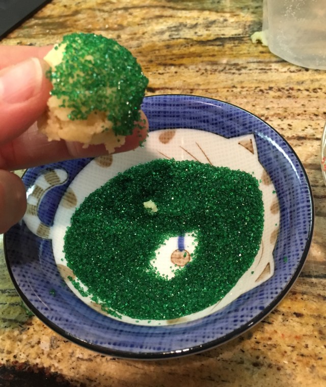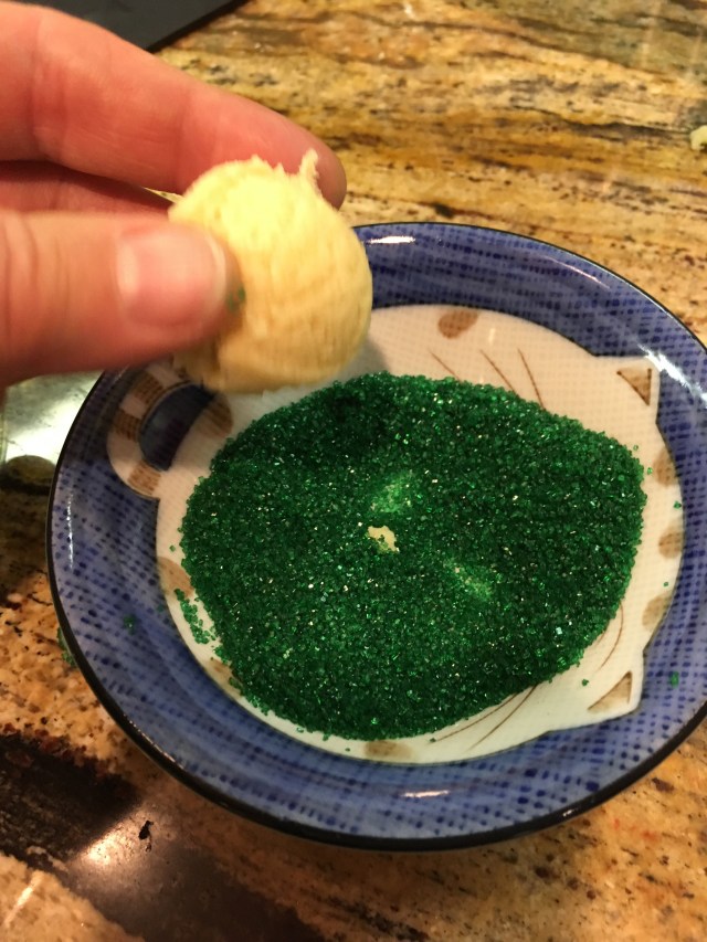 If you want to make them more Christmasy, when you pop the cookie out of the scoop, catch it in your fingers. Roll the round end in red or green sugar crystals. Set each cookie on the cookie sheet covered with parchment paper. Bake as directed above.