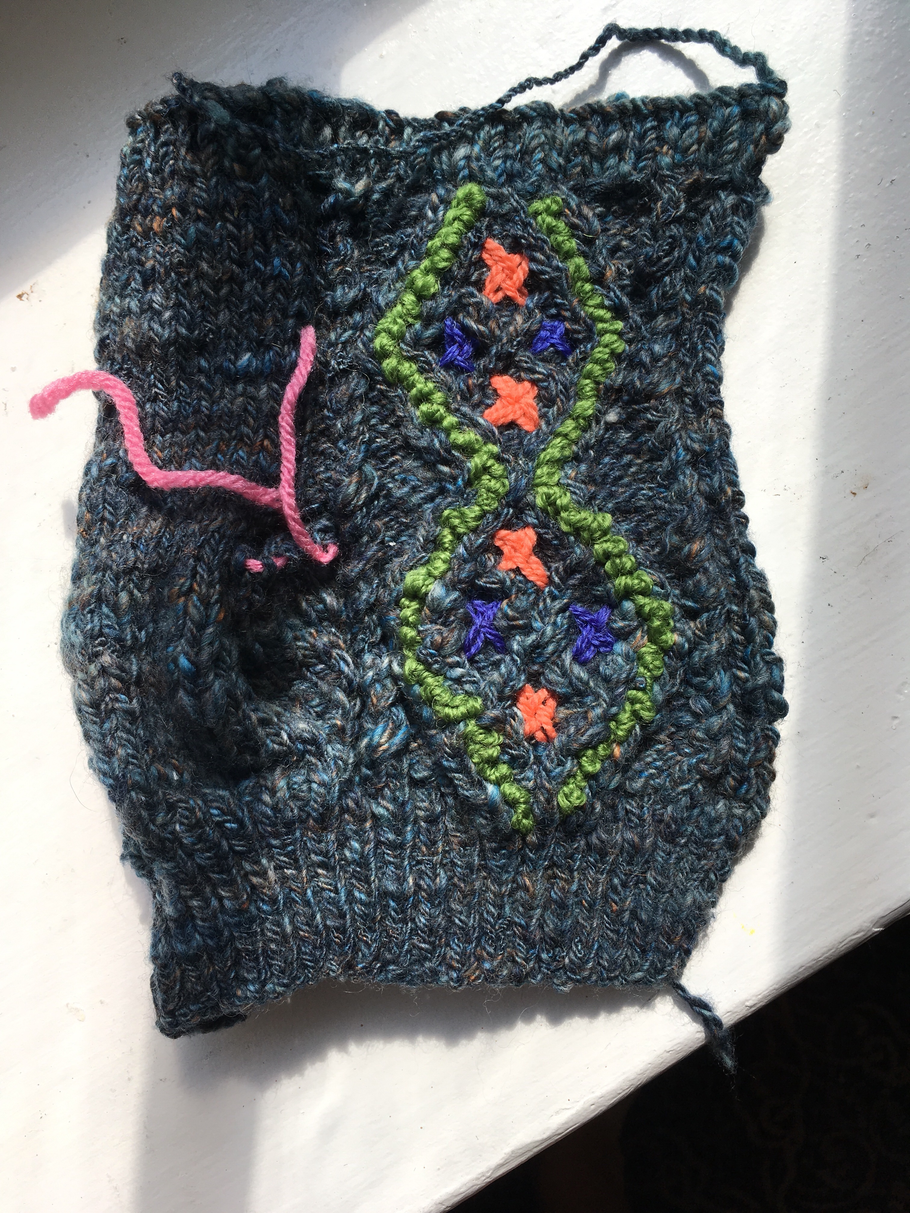 Second, I used peach and purple wool to fill each of the little diamonds with a cross stitch flower.